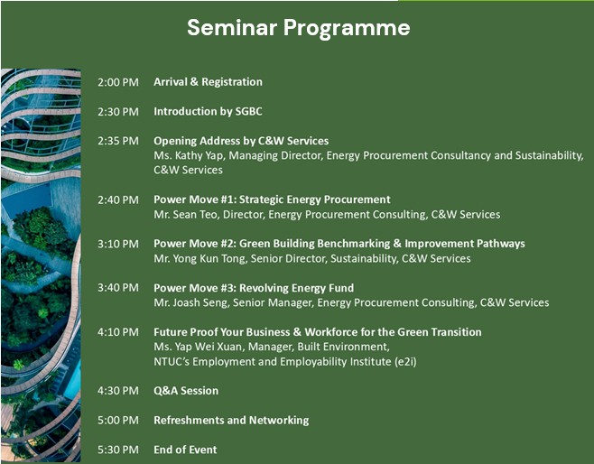 This SGBC Seminar, supported by SGBC Member C&W Services, will present a practical three-part playbook of “Power Moves” to help organisations take control of rising energy costs while advancing both financial and environmental sustainability. The session will cover strategic energy procurement, innovative approaches to green building benchmarking, and sustainable internal financing mechanisms.